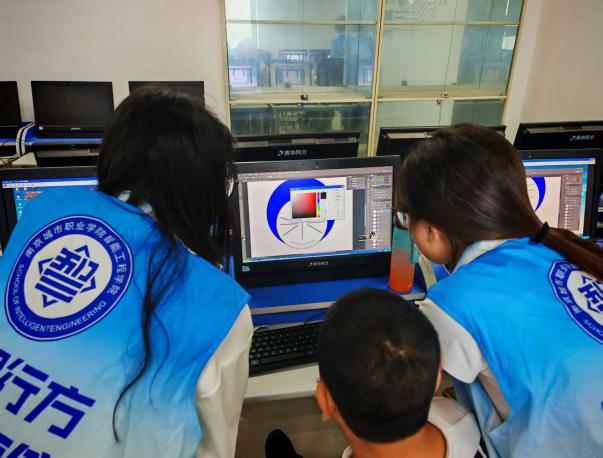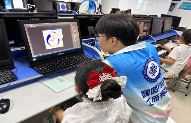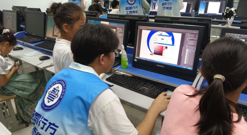 课堂上,志愿者用“魔法画笔闯世界”的趣味比喻,将PS软件的画笔工具、图层等专业知识转化为生动内容,并通过动画演示,让孩子们直观感受线条“变魔法”的奇妙过程。分组教学时,志愿者“手把手”指导数位板使用,当孩子们成功画出第一笔色彩,教室里满是兴奋的欢呼。