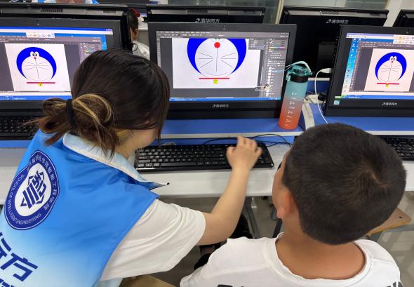 掌握基础操作后,孩子们在完成志愿者所教的哆啦A梦绘画后,他们开始尽情发挥想象。有的绘制“会飞的房子”,有的创作“海底乐园”,还有的设计“梦想学校”。志愿者在旁悉心指导,鼓励尝试新技巧。一幅幅充满童真的作品,展现着孩子们的独特创意。
