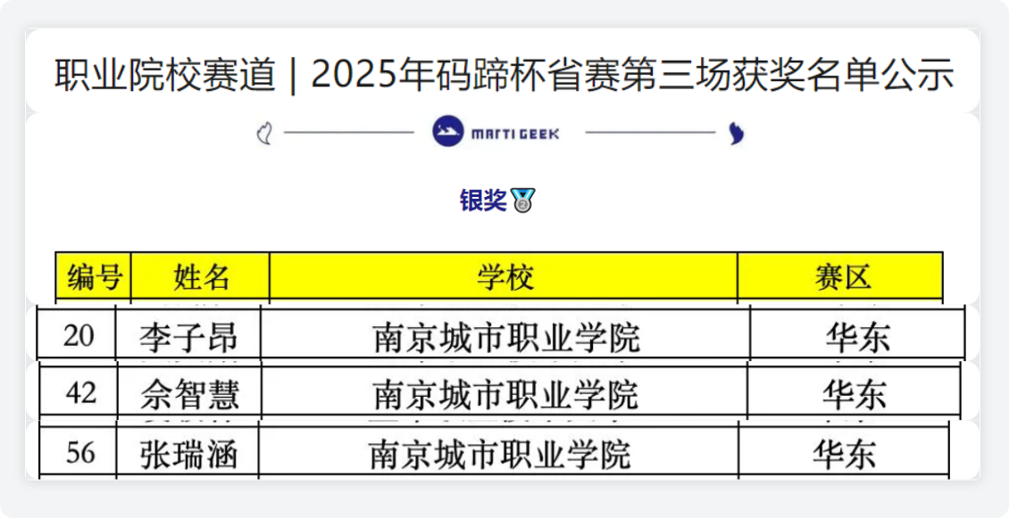由全国高等学校计算机教育研究会主办、清华大学出版社承办的2025年码蹄杯全国大学生程序设计大赛顺利举办。我们伟德国际victor1946智能控制技术专业李子昂、佘智慧、张瑞涵3名同学获得职业院校赛道(省赛)银牌,电子信息技术专业的王定娴同学获得职业院校赛道(省赛)铜牌。