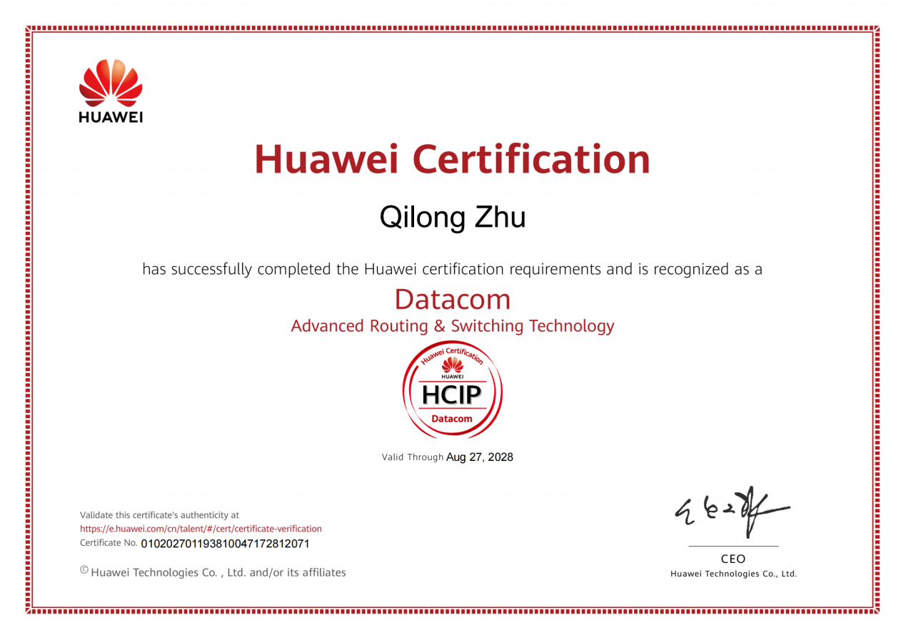 此外,朱奇隆老师和孙菁遥老师在经过一段时间的学习与备考后,成功考取了华为HCIP证书。华为HCIP(Huawei Certified ICT Professional)认证是华为针对ICT领域技术人员推出的高级工程师级别认证,具有较高的行业认可度。两位老师通过考取此证书,不仅提升了自身在华为技术领域的专业能力,也为学院的华为相关课程教学注入了新的活力。