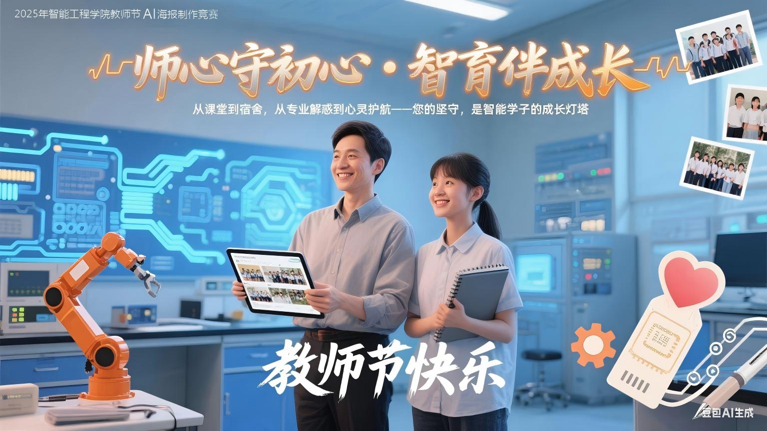 本次活动以“感恩·坚守·创新”为核心,结合AIGC技术创作教师节主题海报,分设“感谢师恩”(学生组)与“坚守师心”(教师组)双赛道,展现对教师职业的敬意与教育事业的美好愿景。活动从8月初开始,全院师生积极参与海报制作,共提交了91组作品(其中学生提交32组、教师提交59组)。这些作品不仅展现了师生对AI技术的熟练运用,更蕴含着深厚的教育情怀。经过评审,最终学生组吴欣潼《师恩如灯》、张枥方《师恩如河,载梦逐光》、胡雅文《老师,这是您第3652次光合作用》、夏佳敏《感谢恩师》、谈乃健《师恩如光 桃李芬芳》,教师组张超英《师心守初心 智育伴成长》、戚华《匠心育桃李・师恩润匠心》等7篇作品获一等奖。