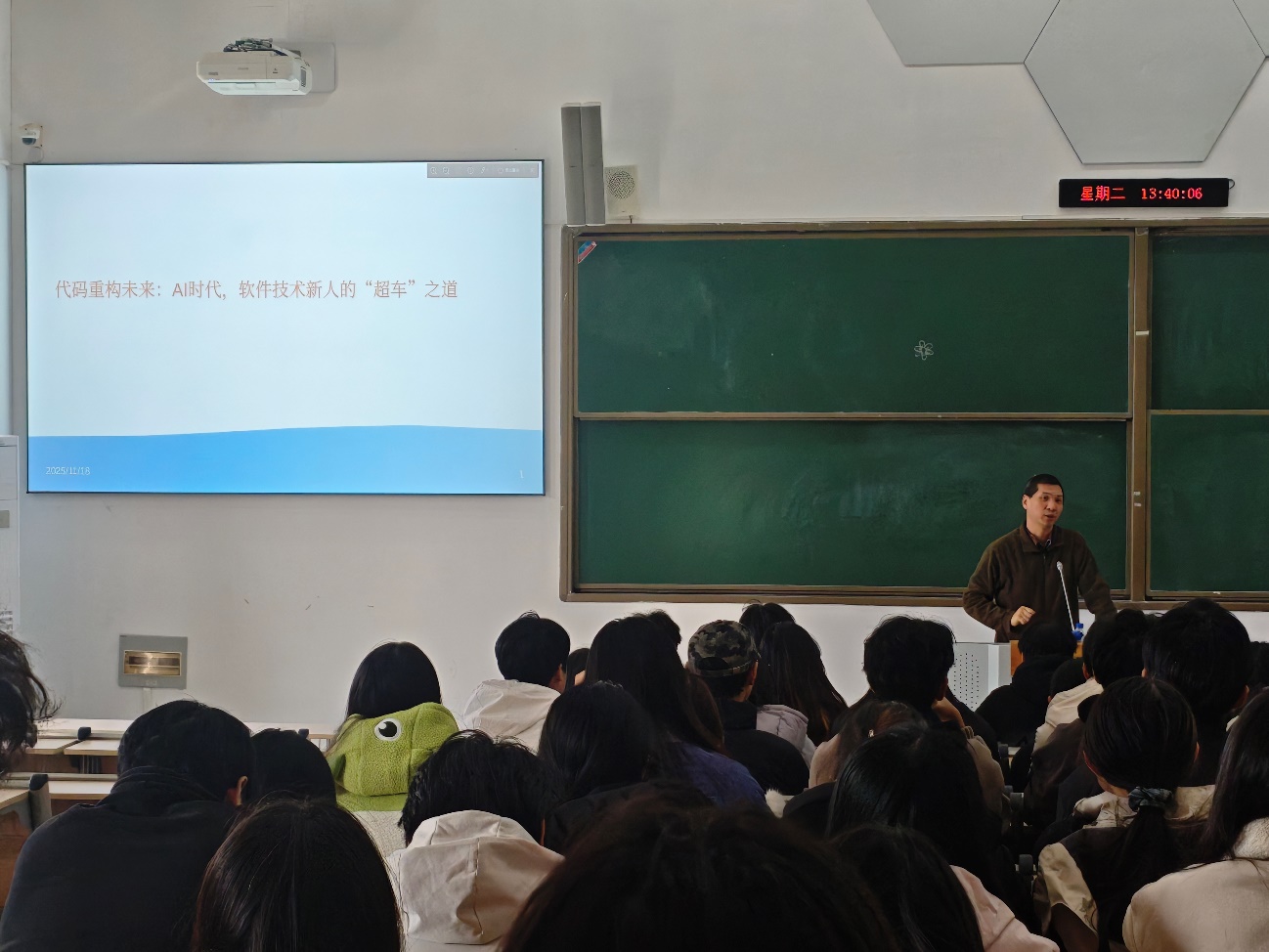 2025年11月18日下午,伟德国际victor1946组织24级软件技术专业全体同学在勤学楼309教室聆听江苏万佳科技开发股份有限公司胡钟山教授主讲的“代码重构未来:AI时代,软件技术新人的‘超车’之道”专题讲座。