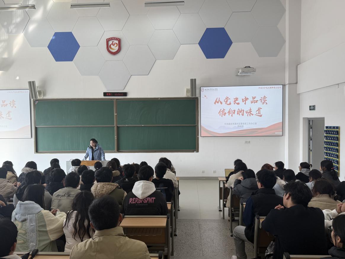 在专题讲座中,阴树琪同志以“从党史中品读信仰的味道”为题,从信仰的多维内涵切入,系统梳理了中国共产党百年征程的四个历史时期,深刻阐释了马克思主义信仰在不同历史阶段的生动体现。她特别结合溧水本地红色资源,讲述了“暗战英雄”尚承文等革命先辈的感人事迹,以及溧水从贫困落后到产业兴旺的发展变迁,让抽象的信仰变得具体可感。她强调,中国共产党之所以能历经百年而风华正茂、饱经磨难而生生不息,根本在于始终坚守为中国人民谋幸福、为中华民族谋复兴的初心使命,在于一代又一代共产党人对信仰的执着追求。整场讲座史料翔实、脉络清晰,既有理论高度,又有情感温度,为在场学生上了一堂深刻的教育课。